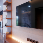 Naik ke lantai dua, suasana yang lebih personal dan dinamis mulai terasa. Ruang keluarga menjadi area berkumpul yang hangat, sementara lorong difungsikan sebagai area kreatif dan ruang multifungsi, menawarkan fleksibilitas untuk berbagai aktivitas. Berbeda dari ruang lain yang mengusung konsep klasik, area ini mengadaptasi desain homie, dengan dominasi material kayu dan aksen kulit batu, menciptakan suasana yang lebih santai dan nyaman.