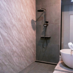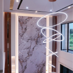 Memasuki rumah, area ruang tamu di bagian depan langsung memperlihatkan nuansa Classic Contemporer yang anggun, dengan detail dekoratif yang menghadirkan kesan timeless dan mewah. Beranjak ke dalam, konsep open space diterapkan pada ruang tengah, ruang makan, dan dapur bersih, memungkinkan integrasi ruang yang lebih luas dan harmonis. Penggunaan material duco yang dominan, berpadu dengan corak motif marmer pada area void serta top table dan backsplash dapur, semakin memperkuat karakter elegan pada interior rumah ini.
