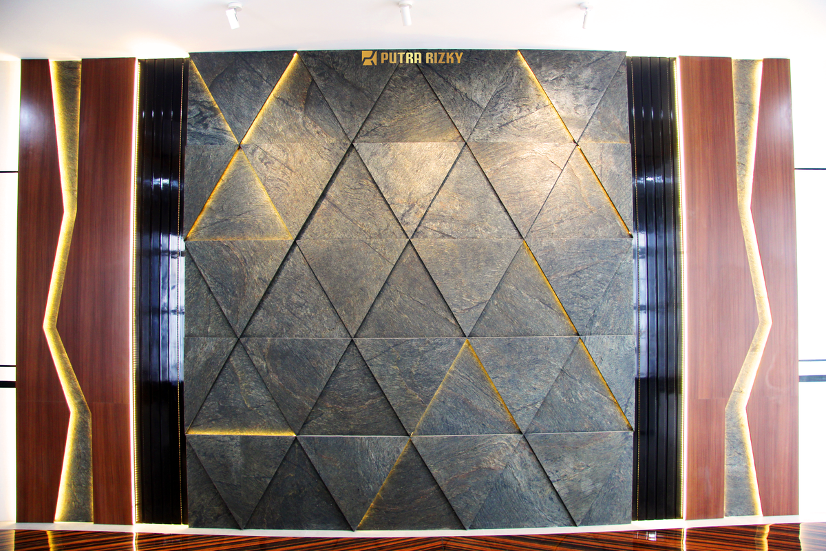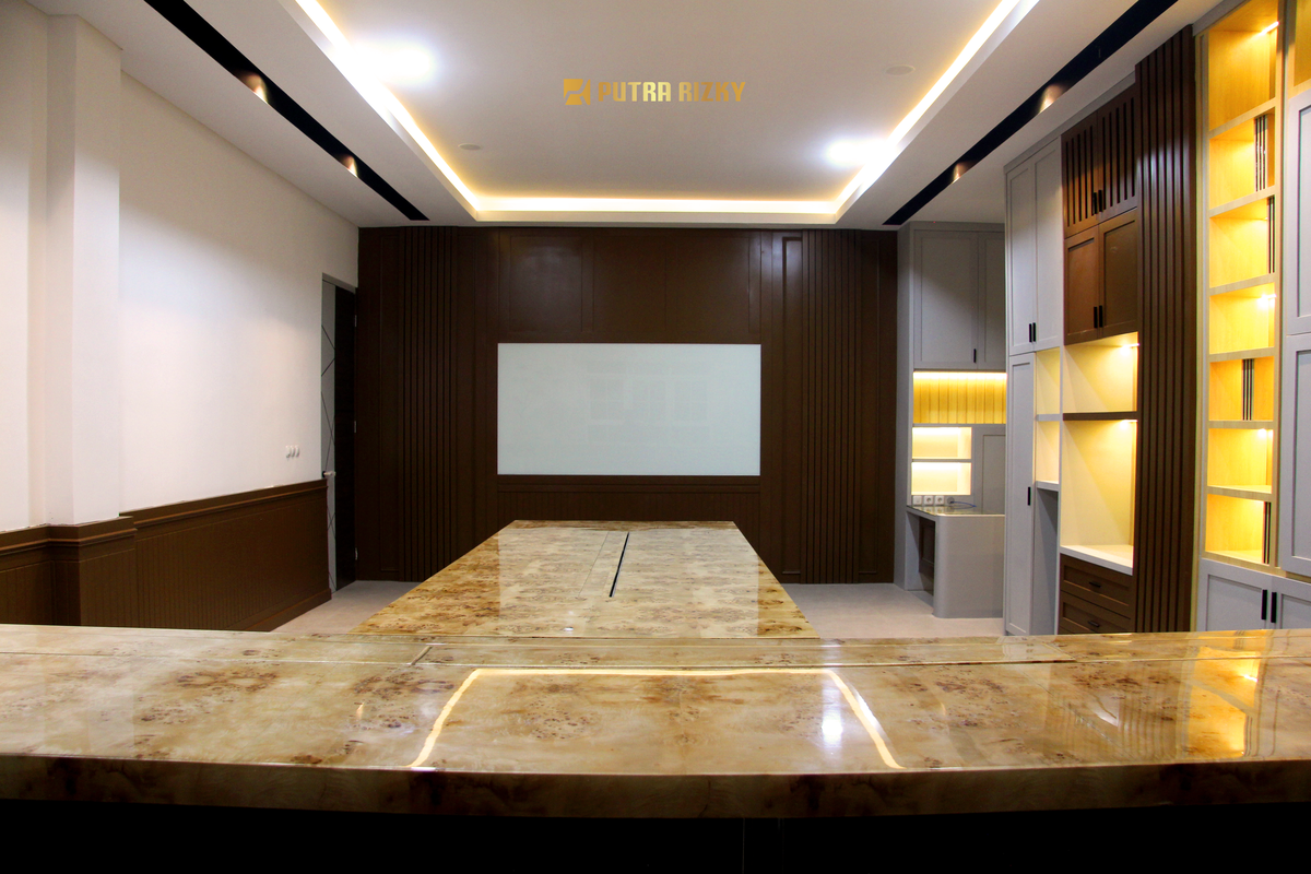 Ruang Meeting menjadi fokus utama dengan backdrop yang menarik, terbuat dari kombinasi material kulit batu, duco, dan HPL, yang diperkaya dengan LED strip untuk memberikan sentuhan pencahayaan yang dramatis. Desain ini tidak hanya menciptakan suasana profesional dalam setiap pertemuan, tetapi juga menunjukkan kepiawaian kami dalam memadukan bahan-bahan berkualitas untuk mencapai kesan yang diinginkan.