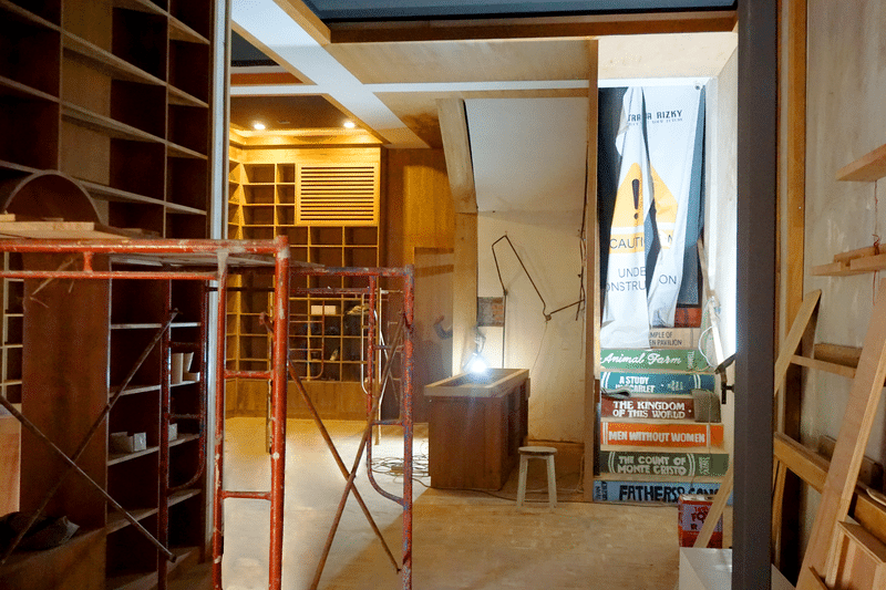 Bagian depan perpustakaan didominasi oleh warna hitam kebiruan dengan aksen emas, menciptakan kesan elegan dan berkelas, sementara penggunaan kayu pada ceiling menonjolkan nuansa mewah yang hangat. Rak buku dibuat menjulang hingga ceiling dan dilengkapi dengan lampu strip untuk menambah nuansa modern sekaligus mempermudah pencarian buku.