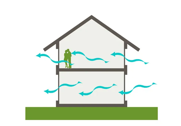 Ventilasi silang (cross ventilation) adalah metode pengaturan aliran udara dalam rumah dengan cara menciptakan dua bukaan atau lebih yang saling berseberangan. Udara akan bergerak dari satu bukaan ke bukaan lainnya, menghasilkan aliran yang terus-menerus. Aliran udara yang efektif ini mampu mendorong udara panas keluar dan menggantinya dengan udara yang lebih sejuk dari luar. Ventilasi silang tidak hanya membantu menjaga suhu ruangan, tetapi juga meningkatkan kualitas udara di dalam rumah.